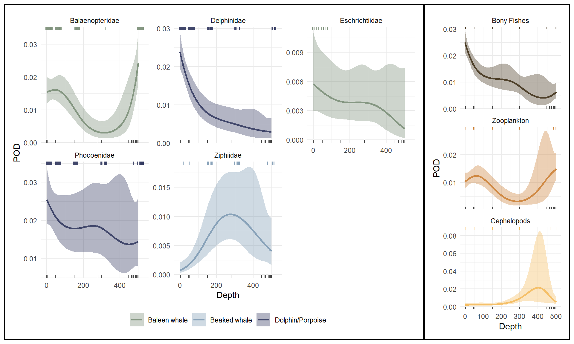 Models stratifying detections by taxonomic Family and preferred prey type both had lower AIC values than the model stratified by species (AIC = 4854 and 4960, respectively); however, these models still had significant terms for Family and depth x Family interactions (taxonomic model) and for depth, prey type, and depth x prey type interactions (prey type model). Predicted POD curves for each model illustrate varying trends in POD with depth across strata (Figure 4). Similar to the model stratified by species, we did not make predictions for Families with fewer than 10 detections using the taxonomic model, which excluded the Balaenidae (bowhead whale family).