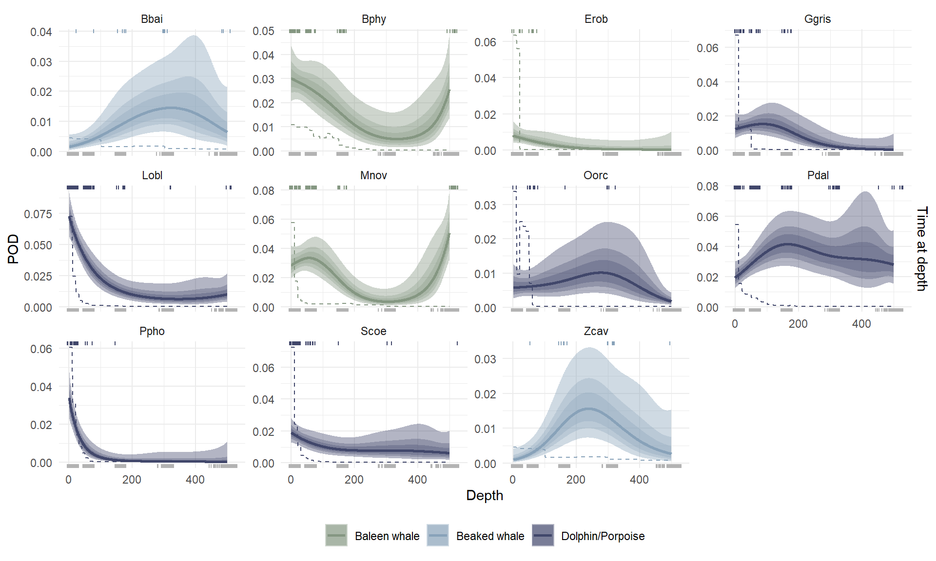 Among the delphinids, species-specific trends in POD generally reflected model estimates of time-at-depth. Conversely, most beaked whale and baleen whale species in the study were very likely to be detected outside depths where they spend most of their time (Figure 3). Most notably, predicted POD-at-depth plots for two of the three baleen whales indicated a high probability of detection at 500 m, while these two species spend most of their time above ~200 m. Per-species model predictions are shown alongside observed detections in Supplemental Figure S5.