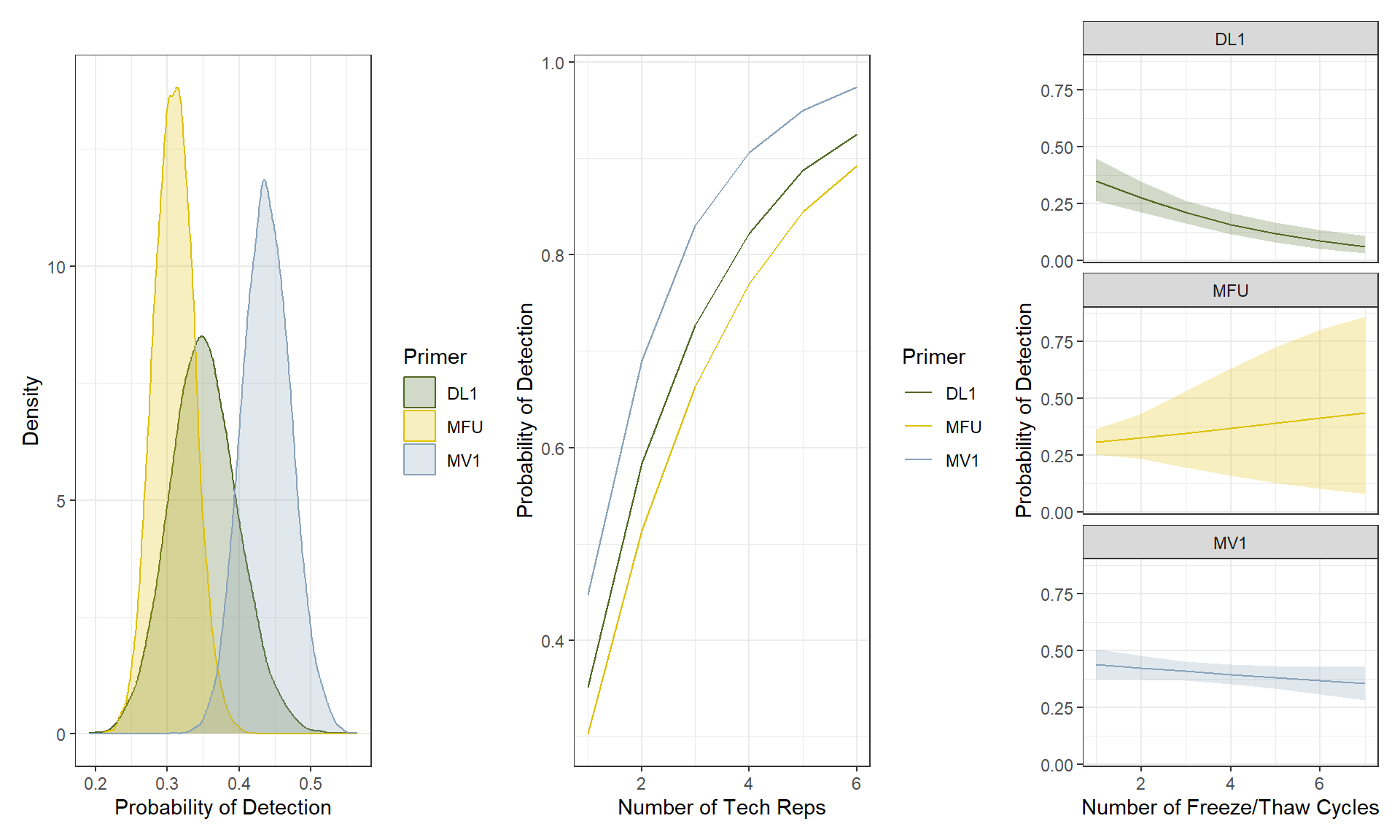 While increasing the number of technical replicates increases POD, we found that DNA degradation by freeze/thaw cycles can decrease the POD of DNA in a sample (Figure 2, right). We found a significant relationship between freeze/thaw cycle and posterior estimates of POD for the longest primer in our study (DL, 360 bp), and a weaker and nonsignificant relationship between freeze/thaw cycle and posterior POD for MV1 (202 bp). There was no relationship detected between posterior POD and freeze/thaw cycles for MFU (185 bp), noting that only 5 of 516 total MFU samples sequenced in this study had > 2 thaw cycles.