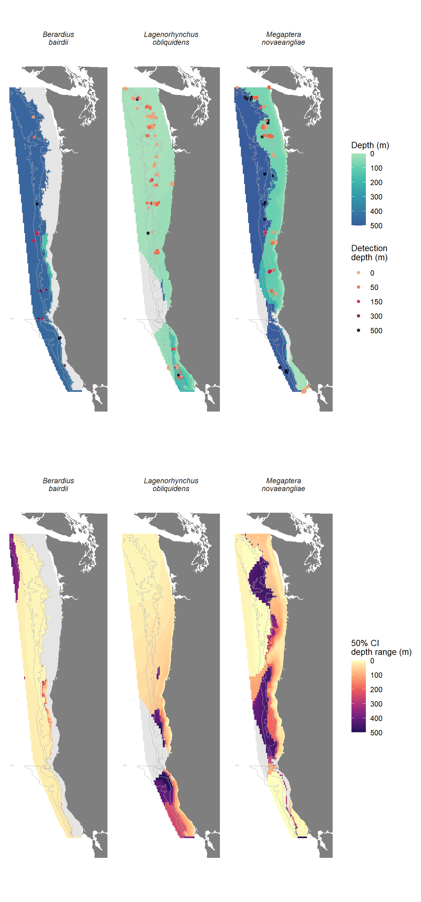 In addition to examining geographic patterns in the depth of maximum POD, we examined uncertainty around these values by mapping the range of depths that fell within the 50% confidence interval of maximum POD (Figure 5, bottom). In the northern portion of the study area, where Pacific white-sided dolphins are most likely to be observed near the surface, the range of depths within the 50% CI of maximum POD is neglgible (minimum depth range = 0 m). That range increases toward the south and east (maximum depth range = 500 m), with the greatest variability in the south and east of the study area, near the region where POD is close to 0. Baird’s beaked whales exhibited minimal variability in 50% CI width of maximum depth (minimum depth range = 0 m), except for a small portion of the northwestern edge of the study area (maximum depth range = 470 m) near the edge of the prediction grid.