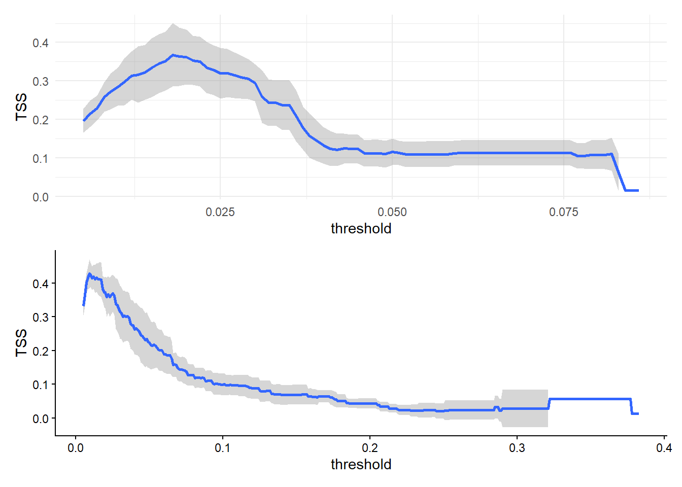 We assessed model fit using AIC, and model performance using standard metrics including the percent of deviance explained, the area under the receiver operating characteristic curve (AUC, Fawcett 2006), the true skill statistic (TSS, Allouche, Tsoar, and Kadmon 2006), and a visual comparison of predicted vs. observed detection rates across sampling depths. We also visually compared our model-based predictions of probability of detection across depth with estimates of species-specific time-at-depth as reported by Watwood and Buonantony (2012) and the U.S. Department of the Navy (2017).