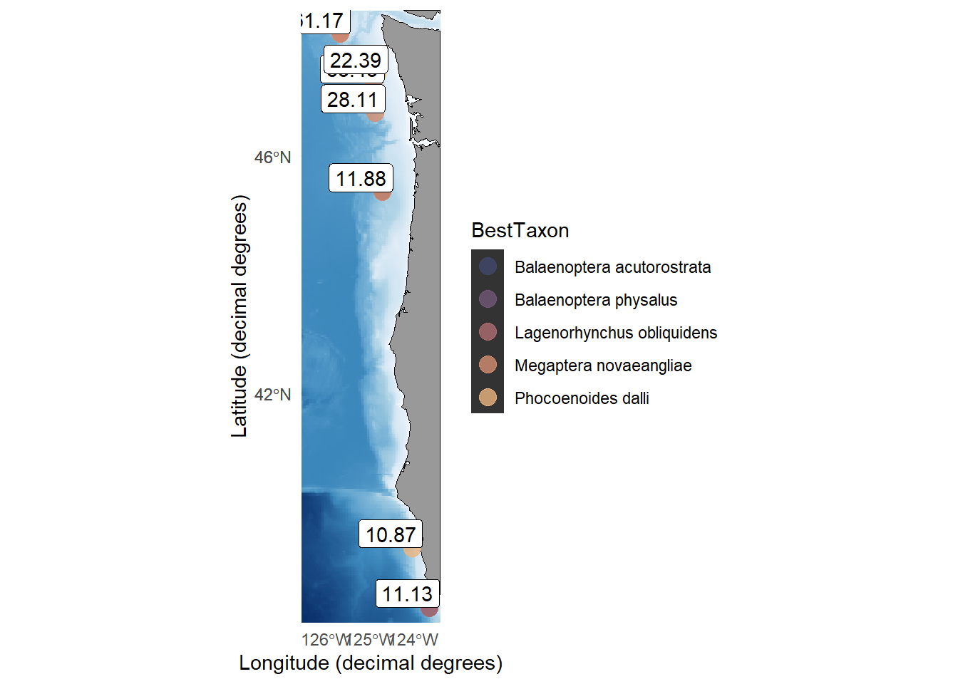 It is likely that variability in the \(z\) distribution of species-specific POD represents a combination of both \(xy\) variability in species-specific use of the water column, as well as \(xy\) variability in eDNA sinking and residency times. In both cases, underlying oceanographic processes are an important driver of the observed patterns. To assess these links between oceanography and 3D spatial distribution, our next study will explicitly focus on the development of 3D spatial distribution models using eDNA and using these models to determine the important oceanographic drivers of cetacean eDNA in 3D space.