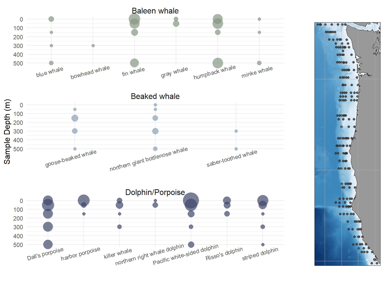 Across all samples, we observed 468 positive detections of 16 cetacean species, including 6 baleen whale species, 5 dolphin species, 2 porpoise species, and 3 beaked whale species (Table 1). 11 species were observed more than 10 times, and and additional 5 were observed fewer than 10 or fewer times. Notably, this includes one detection of a bowhead whale (Balaena mysticetus), as well as three detections of saber-toothed whales (Mesoplodon stejnegeri). Figure 1 illustrates the distribution of detections across sampling depths z, ignoring xy distribution, for all cetacean species included in the study.